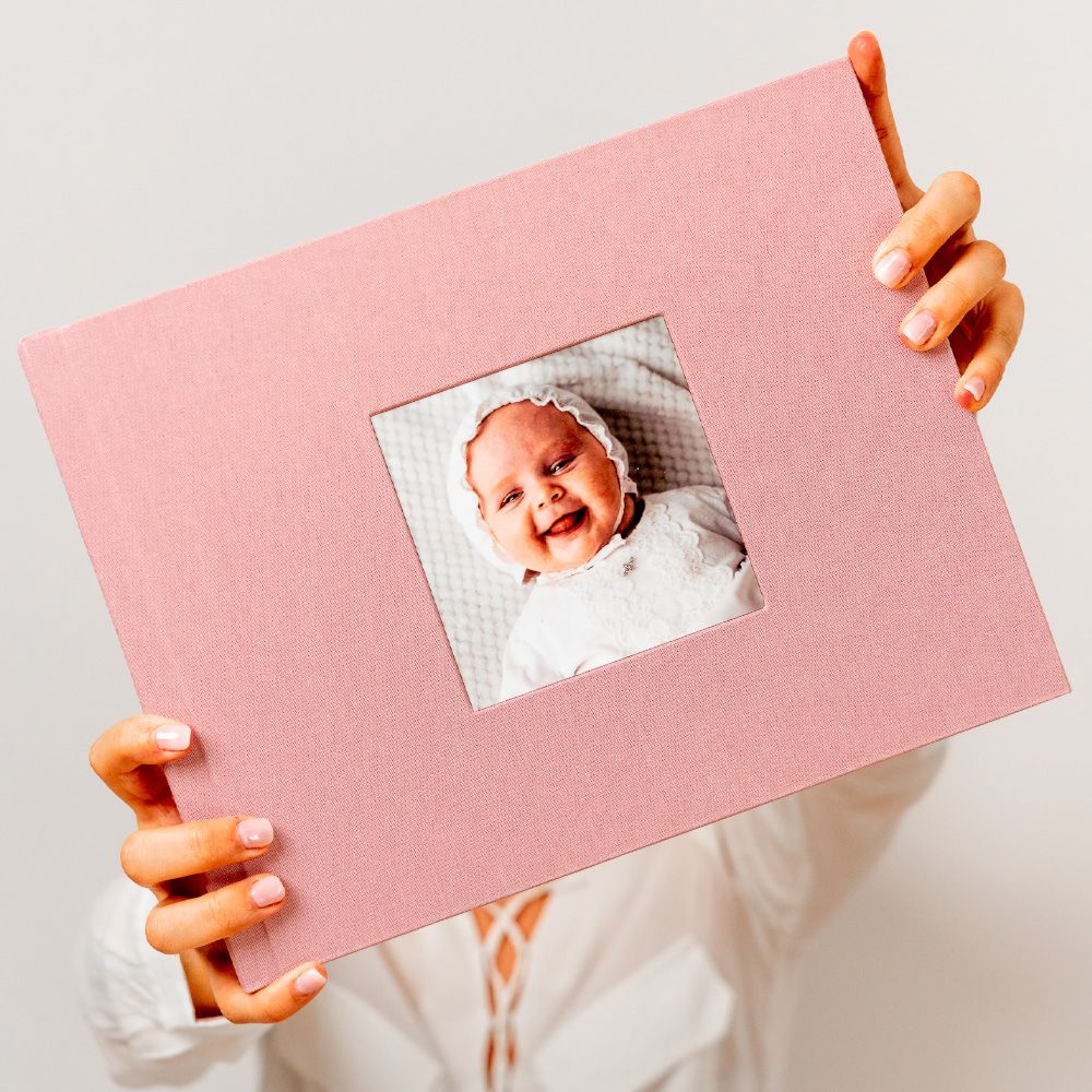 No modelo Cameo, a capa abre uma janela para a emoção. A tua fotografia favorita é integrada de forma permanente na capa em tecido, criando um leve relevo que a transforma no coração do álbum e num convite imediato para descobrir as memórias que guarda no interior.